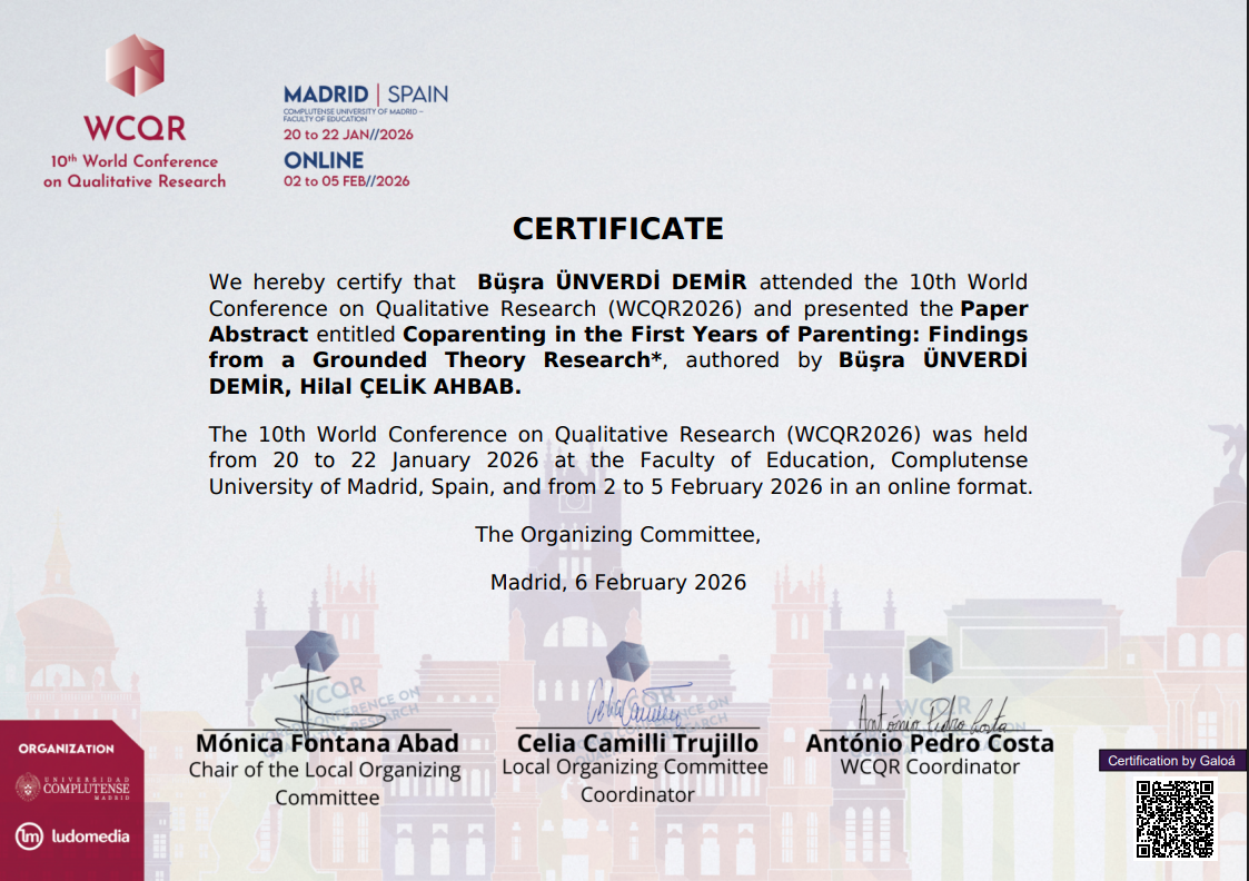 Eğitim Fakültesi Eğitim Bilimleri Bölümü Rehberlik ve Psikolojik Danışmanlık Anabilim Dalı araştırma görevlisi Büşra Ünverdi Demir, 10. Dünya Nitel Araştırma Konferansı’nda (10th World Conferece on Qualitative Research) bildiri sunumu gerçekleştirmiştir. “Coparenting in the First Years of Parenting: Findings from a Grounded Theory Research” başlıklı bildiride, birlikte ebeveynlik süreçlerinin Türkiye’de orta gelire sahip ve tek çocuğu olan çiftlerde nasıl deneyimlendiğine dair araştırma bulguları yer almıştır. Türkiye’nin sosyal ve kültürel bağlamını dikkate alan ve birlikte ebeveynlik literatürüne katkı sunan bildiri özetine şu bağlantı üzerinden erişilebilir: https://proceedings.science/wcqr-2026/papers/coparenting-in-the-first-years-of-parenting-findings-from-a-grounded-theory-rese?lang=en